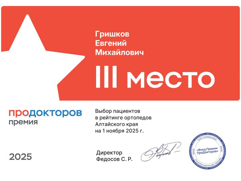 Поздравляем врача Евдокимова Бориса Сергеевича с 1 местом в рейтинге рентгенологов Алтайского края по мнению пациентов на 1 ноября 2025 года!