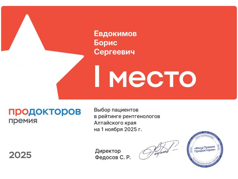 Поздравляем врача Гришкова Евгения Михайловича с 3 местом в рейтинге ортопедов Алтайского края по мнению пациентов на 1 ноября 2025 года!